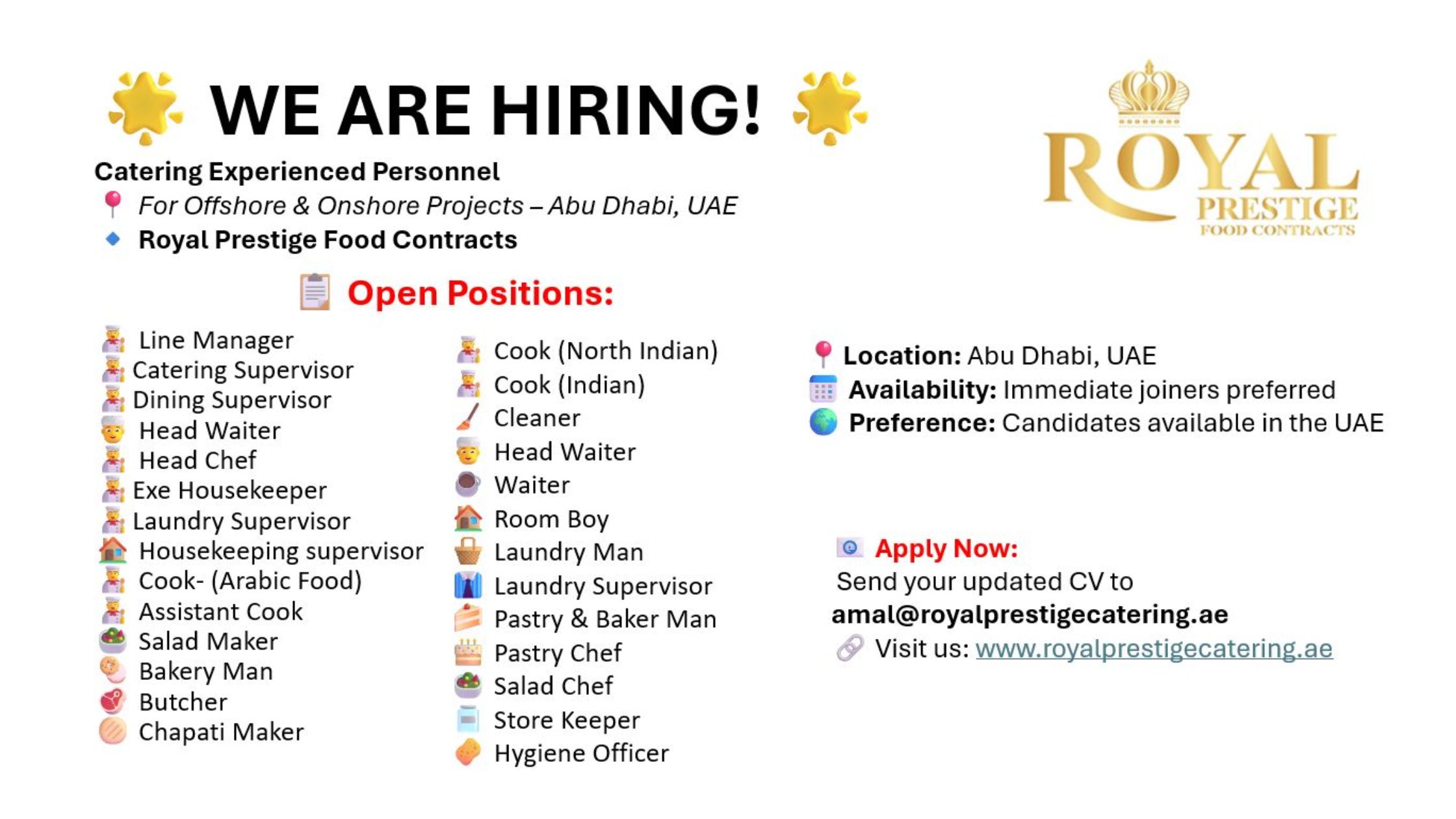 Royal Prestige Catering Abu Dhabi: Are you experienced in catering and hospitality? Looking for an exciting opportunity in the UAE? Royal Prestige Food Contracts is hiring skilled and passionate individuals for offshore and onshore catering projects in Abu Dhabi, UAE.
